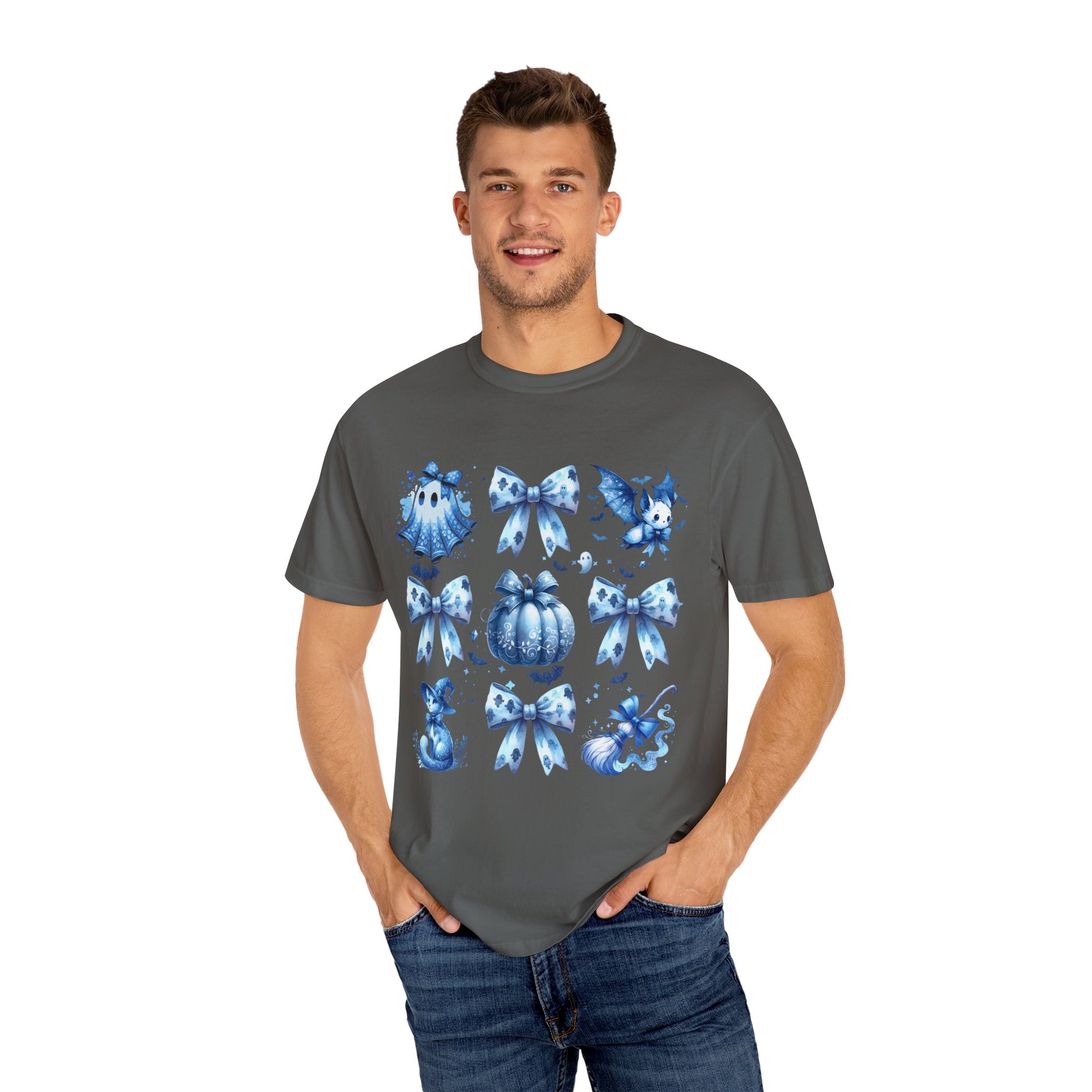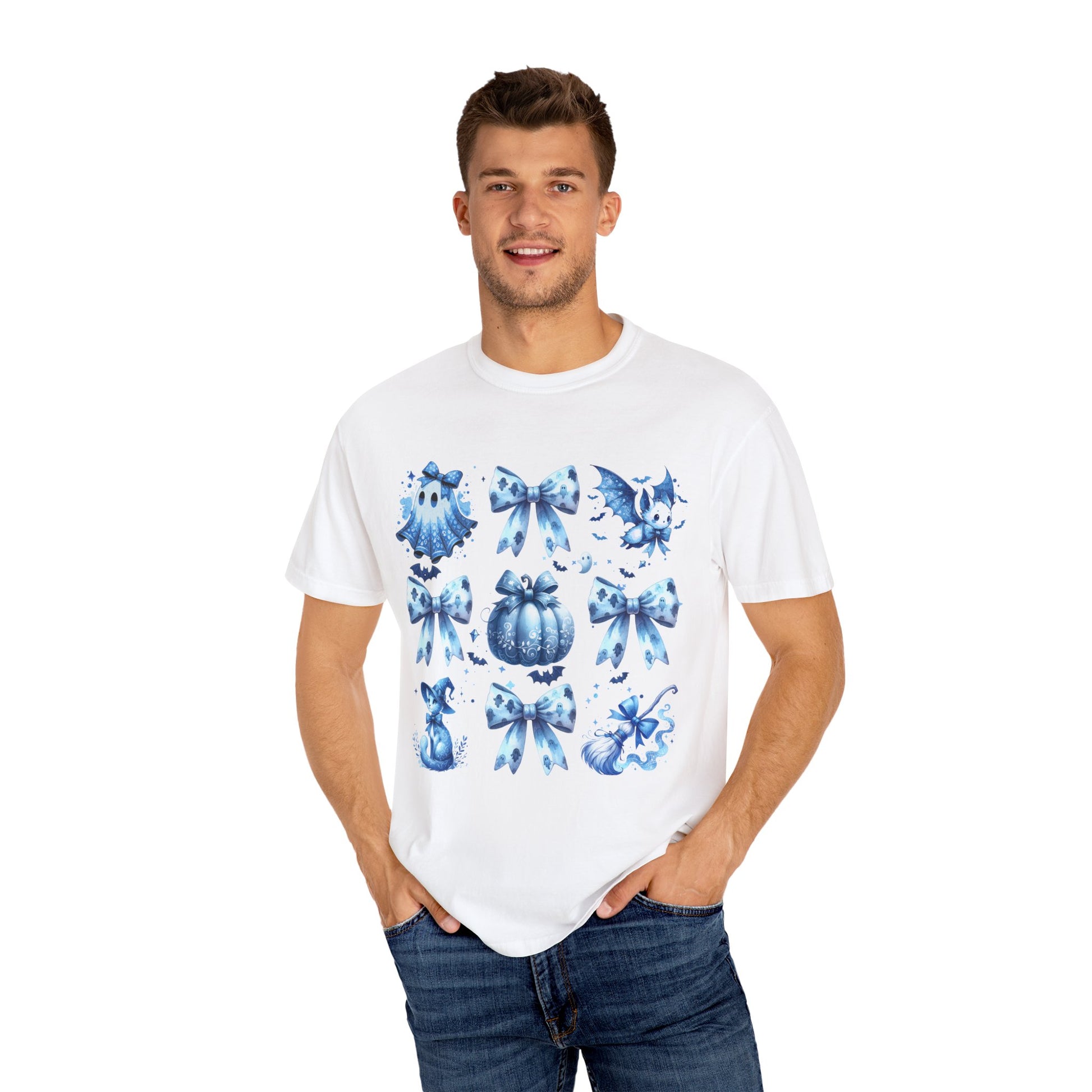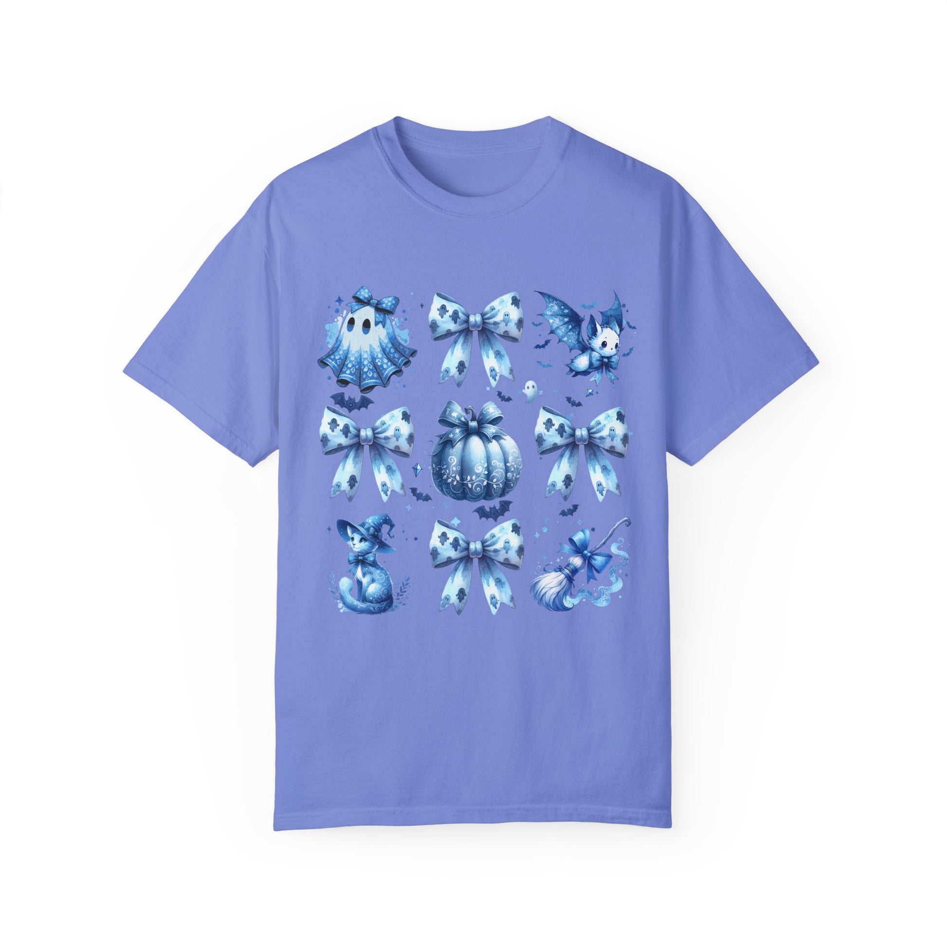 This Halloween-themed t-shirt features a coquette blue bow tie with cute Halloween elements like a broom, pumpkin, cat, ghost sheet, perfect for the Halloween season. It gives off a fun and festive vibe, making it ideal for Halloween parties and trick-or-treating. This unisex garment-dyed t-shirt is perfect for those who love to celebrate Halloween and enjoy dressing up for the occasion.