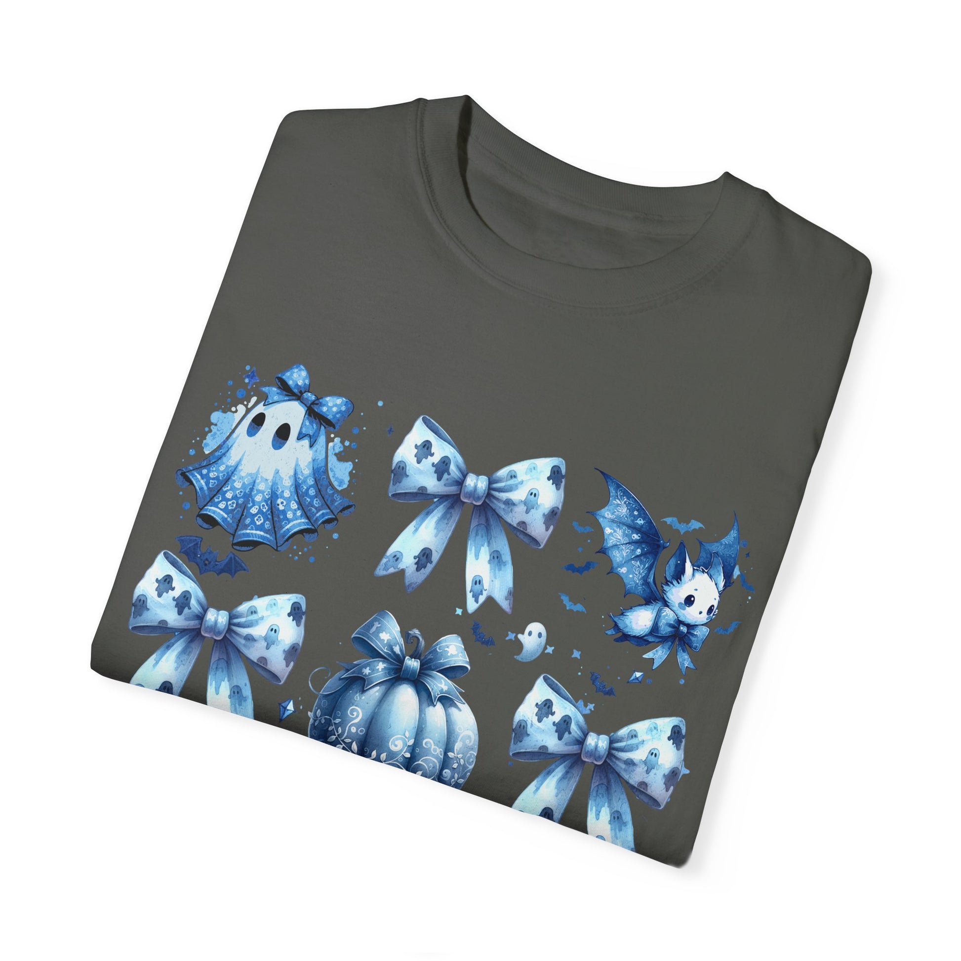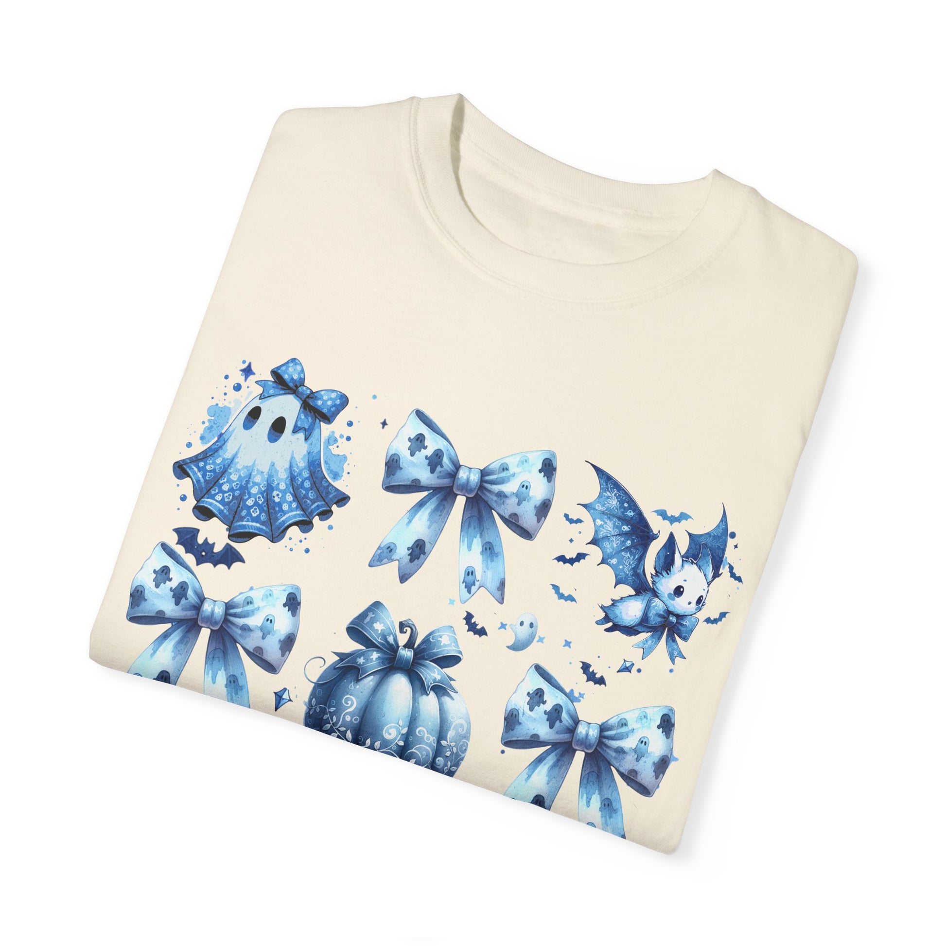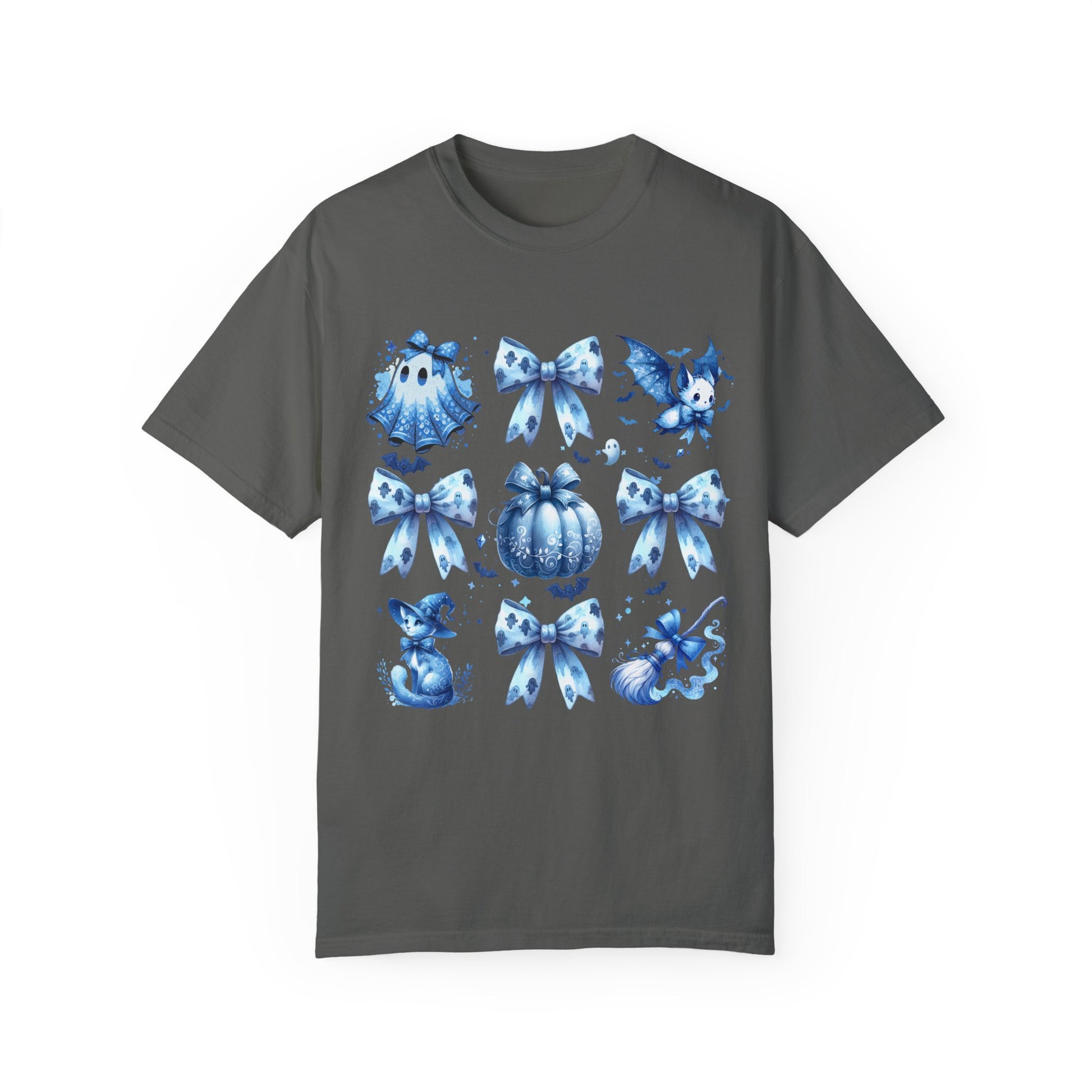 This Halloween-themed t-shirt features a coquette blue bow tie with cute Halloween elements like a broom, pumpkin, cat, ghost sheet, perfect for the Halloween season. It gives off a fun and festive vibe, making it ideal for Halloween parties and trick-or-treating. This unisex garment-dyed t-shirt is perfect for those who love to celebrate Halloween and enjoy dressing up for the occasion.