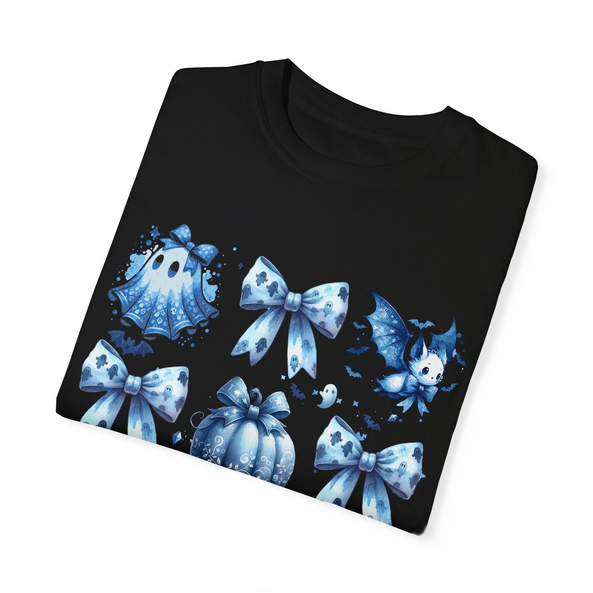 Halloween Coquette T-Shirt, Blue Bow Tie, Broom, Pumpkin, Cat, Ghost, Perfect for Halloween Season, Unisex Tee