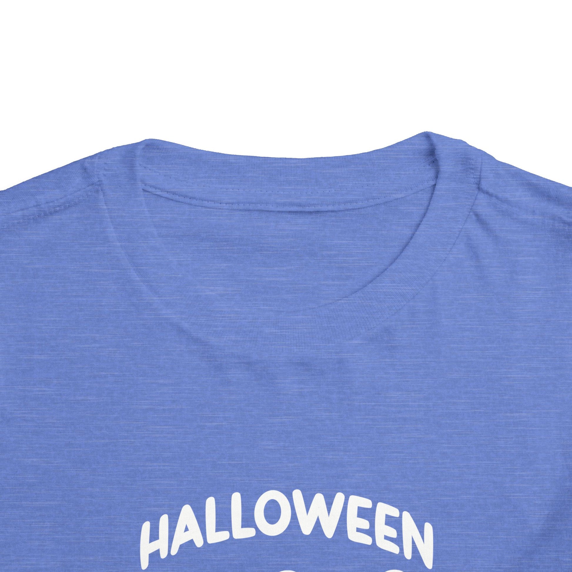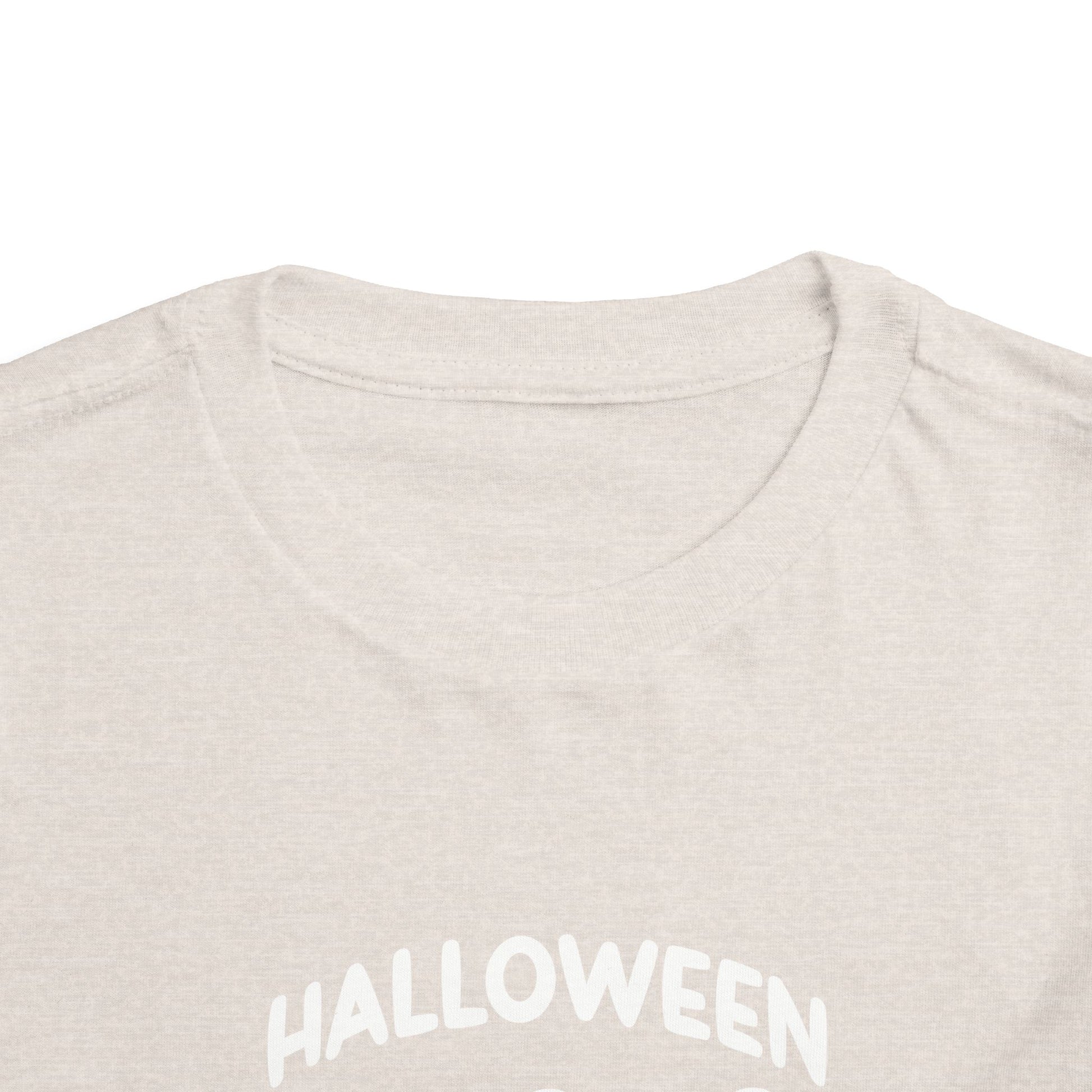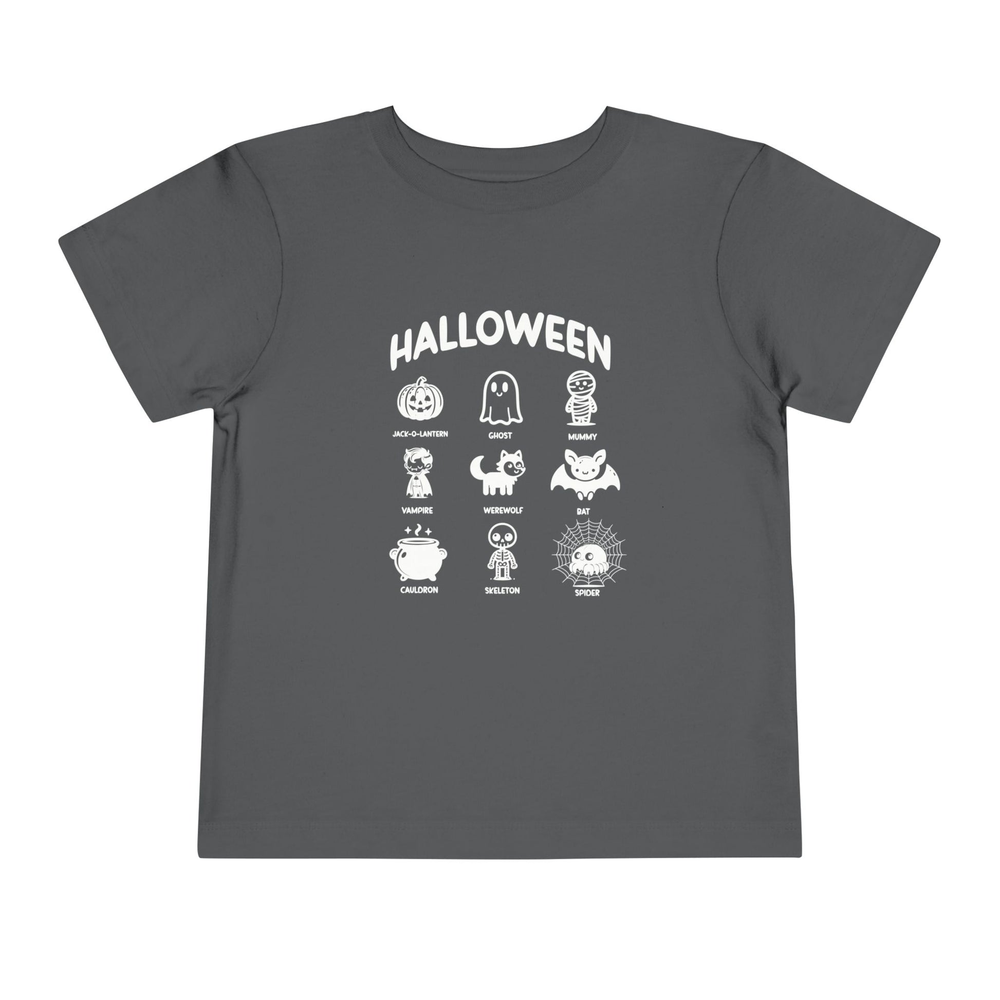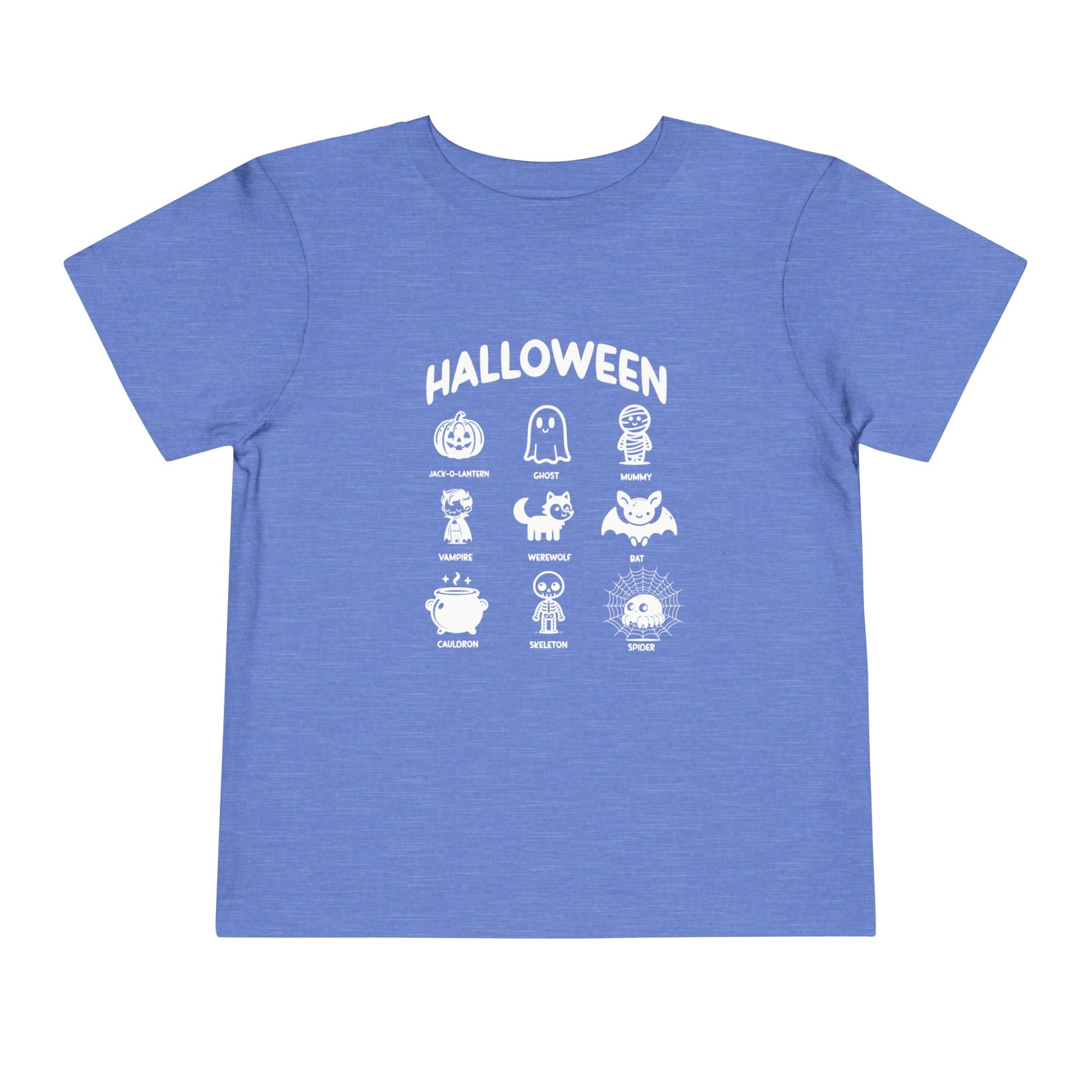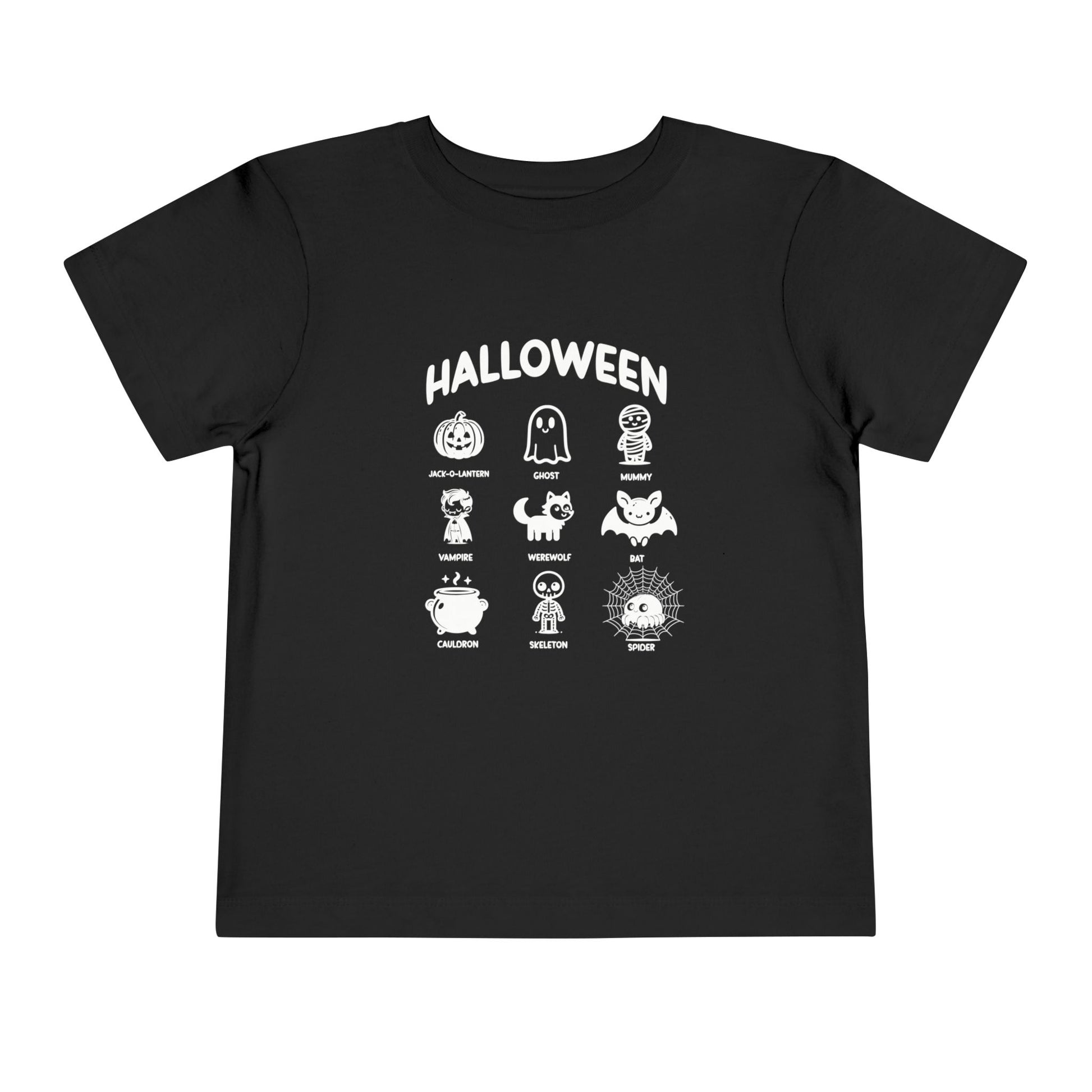Adorable Halloween t-shirt designed for toddlers aged 2 to 5 years old. Features cute Halloween-themed images and names associated with the holiday. Perfect for little ones to wear during Halloween festivities or pumpkin patch visits.